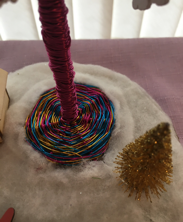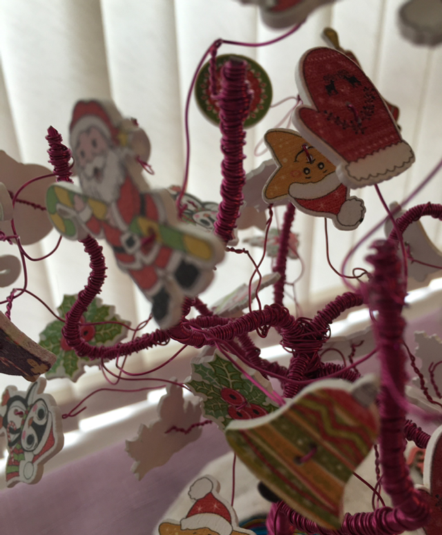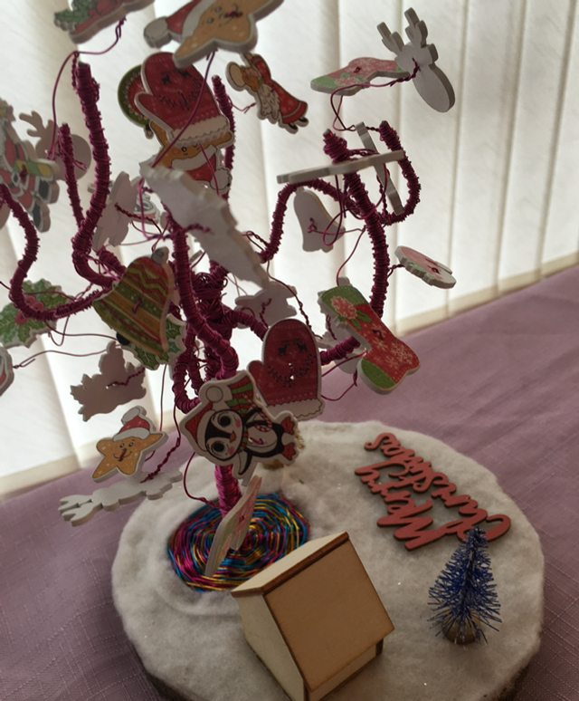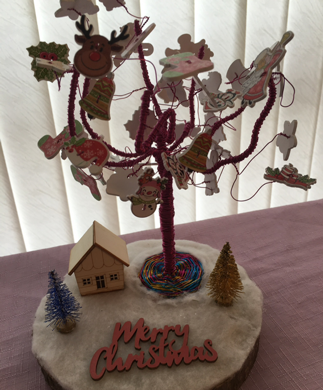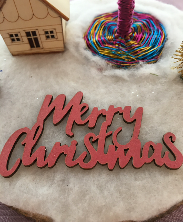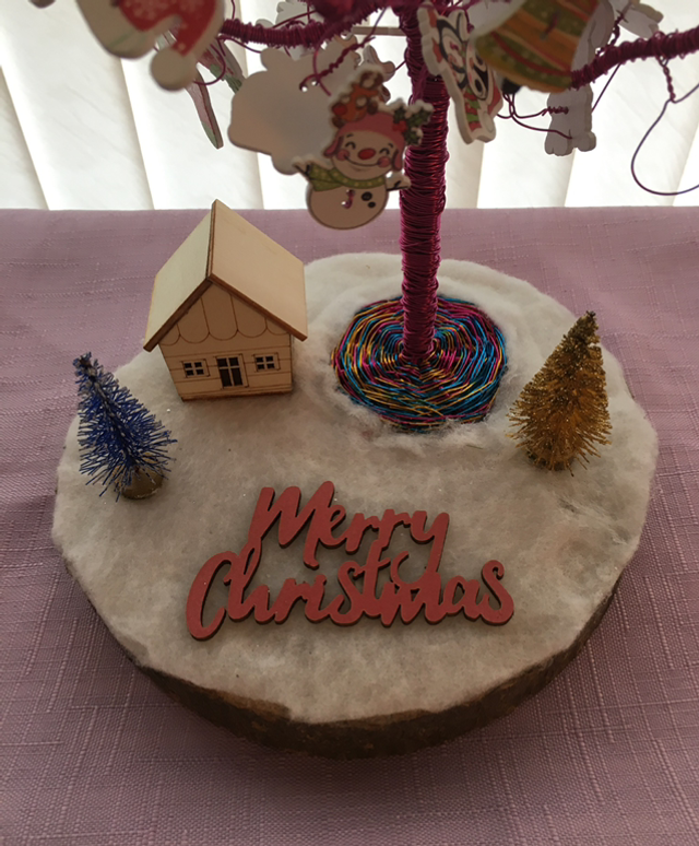 This is a very unusual Christmas Tree, made with bright wire and numerous Christmas buttons. It is mounted on a log slice, covered with snow sheet, with a small house, the words Merry Christmas, and a small bottle brush tree.