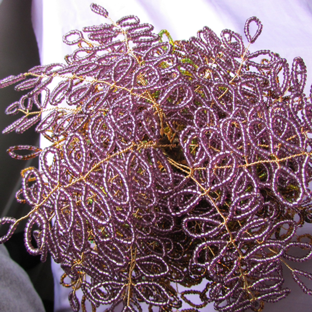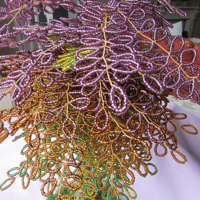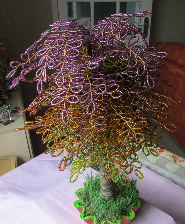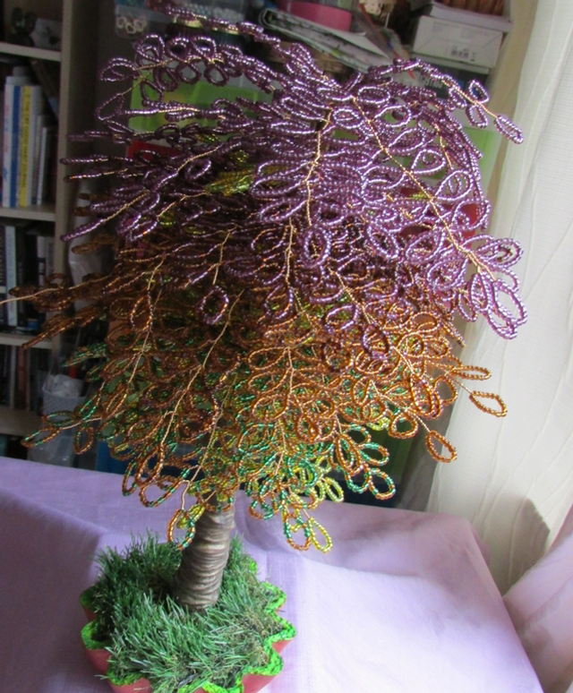 This is a unique large beaded tree. When I saw it in the park, the outside was dark purple and the inner core was still light Green. I tried to duplicate this natural tree and this was the result. It is made from silver lined seed beads and lots of hours carefully weaving them into branches. The tree is lit up with small led lights. It is approximately 40cm high with a diameter of 19cm.